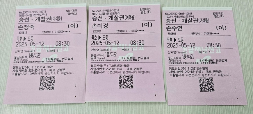 ■.2025년11월05일(수)서울.경기.인천↔동해시(묵호항) 여객터미널 배차정보 동해시(묵호항) 여객선 출항 시간 여객선명:(씨스타1호):정원:442명 ■.묵호(08:30분)→울릉(도동):(씨스타1호) ■.울릉(도동) (12:40분) →묵호:(씨스타1호) (제1호차) ■.영등포신세계백화점정문 새벽:03:00 ■.서울시청역 2번출구 새벽:03:30 ■.잠실역4번출구 직진 100미터 롯데마트정문앞 새벽:04:00 상기지역외 셔틀버스 미운행 (예약손님없음) 입니다 버스탑승시에는 두레고속관광 버스 를 찾으신후 예약자대표자이름 .인원수 말씀후 승차하세요 ■.셔틀버스 (묵호항여객선터미널):최소출발인원안내 서울출발 :영등포(2명).서울시청역(2명).잠실역(2명):확정 경기권 :(안양(10명).수원(10명):출발인원:확정 인천지역 :(송내역(8명).부평역(8명):출발인원:확정