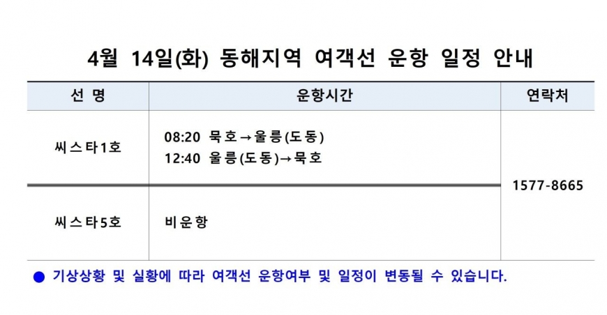 ■.2026년 04월14일 (화요일) 서울.경기.인천↔동해시(묵호항) 여객터미널 배차정보 동해시(묵호항) 여객선 출항 시간 여객선명:(씨스타1호):정원:442명 ■.묵호출항(08:20분)→울릉(도동):(씨스타1호) ■.울릉출항(도동) (12:40분) → 묵호:(씨스타1호) (제1호차) ■.영등포신세계백화점정문 새벽:03:00 ■.서울시청역 2번출구 새벽:03:30 ■.잠실역4번출구 직진 100미터 롯데마트정문앞 새벽:04:00 상기지역외 셔틀버스 미운행 (예약손님없음) 입니다 버스탑승시에는 두레고속관광 버스 를 찾으신후 예약자대표자이름 .인원수 말씀후 승차하세요 ■.셔틀버스 (묵호항여객선터미널):최소출발인원 확정안내 서울출발 :영등포(2명).서울시청역(2명).잠실역(2명):출발확정 경기권 :(안양(10명).수원(10명):출발인원:출발확정 인천지역 :(송내역(8명).부평역(8명):출발인원:출발확정