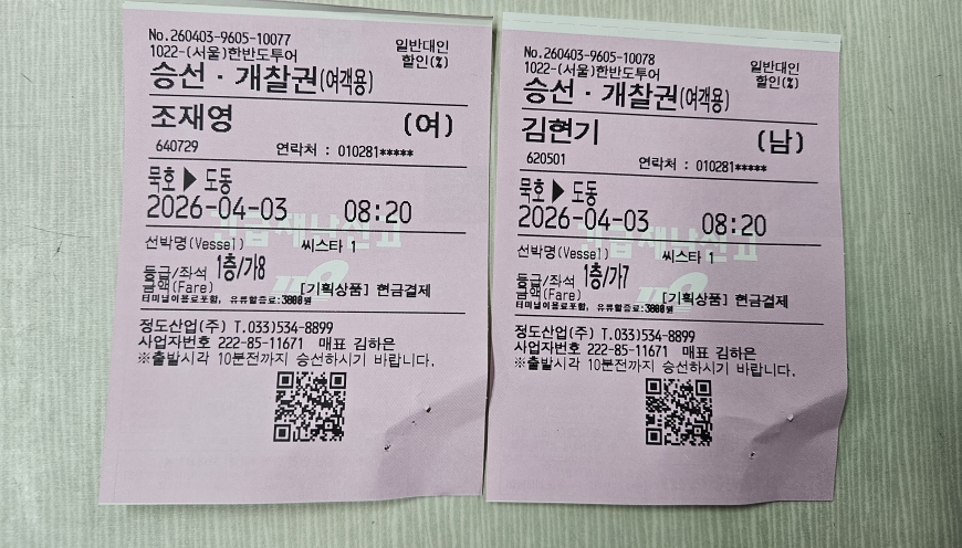 동해시 묵호항여객터미널 주차장 도착후 아침식사 를 합니다 묵호항여객선터미널도착후 배표받는방법 대합실1층 터미널매점 에서 에서 대표자 이름.인원 말씀후 배표받으세요 배표담당자:010-4258-5013 친절과정성을 다해 고객님을 모시겠습니다 서울--묵호 셔틀버스 새벽샌딩자: 010-3137-1312 ■.준비물:신분증 꼭 지참하세요 신분증 미지참시에는 여객선 승선이 거절됩니다 핸드폰 카메라 로 찍은 신분증 절대 승선불가 합니다 울릉도독도전문회사 서울한반도투어 주말 휴일.야간상담가능 (07:00~ 21:30) TEL:02-777-8883